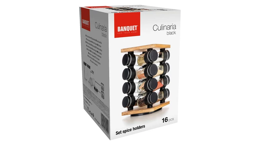 Banquet Culinaria forgatható fűszertartó készlet A készlet 16 db üveg fűszertartót és 1 db forgatható állványt tartalmaz Szín: natúr/fekete •12.990Ft |