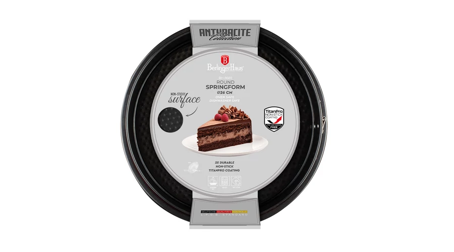 Berlinger Haus Antracit Collection extra minőségű szénacélból készült kerek tortaforma három réteg tapadásmentes titánPro bevonattal.
